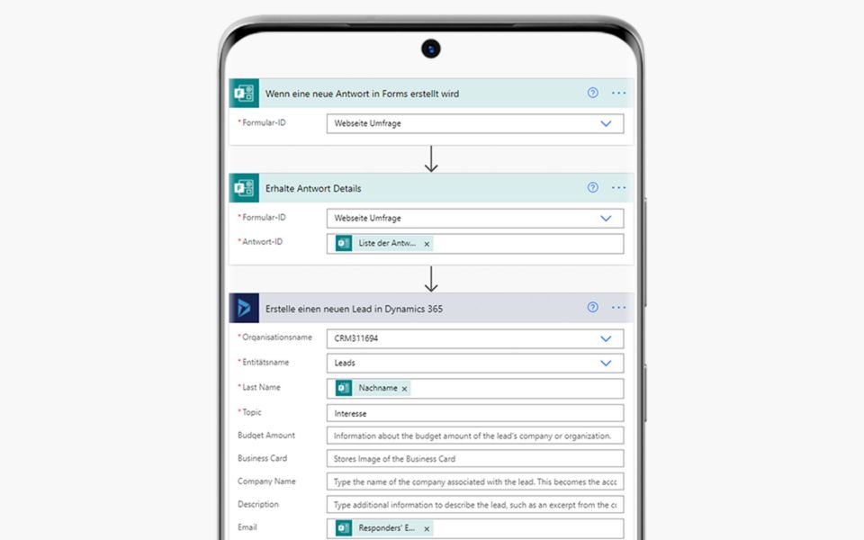 In einem Flow wird bestimmt, welche Aktion ausgeführt werden soll, wenn ein bestimmtes Ereignis eintritt. Erhalten Sie beispielsweise eine E-Mail mit bestimmten von Ihnen festgelegten Schlüsselwörtern, dann werden Sie direkt mit einer Push-Benachrichtigung über Ihr Smartphone informiert. Ist ein Flow einmal eingerichtet und aktiviert, werden die vorgegebenen Aufgaben automatisch durch das System erledigt. Der Flow kann jederzeit durch Ihre Mitarbeiter aktiviert sowie deaktiviert, aber auch auf neue Situationen angepasst werden.